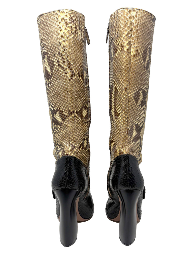 - Boots feature a stretch python-print shaft mimicking a knee-high stocking, integrated into a black patent leather Mary Jane pump with a sculptural curved heel, silver buckle detail, and a zipper closure.