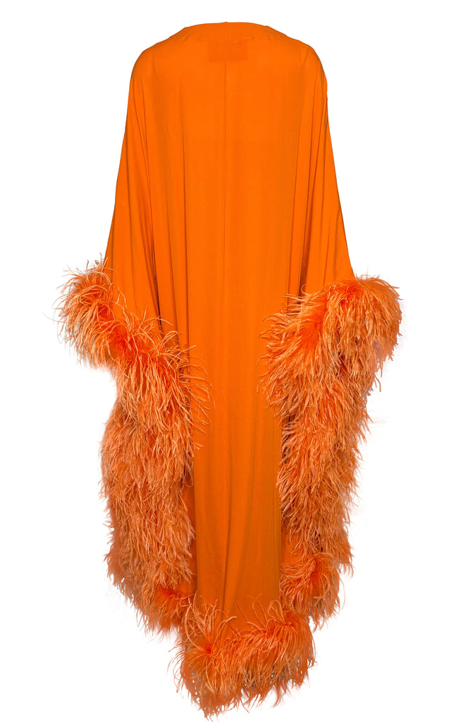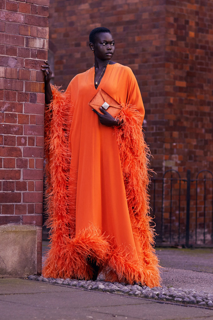 - Orange feather kaftan by Valentino, as seen in the pre-fall 2022 campaign.