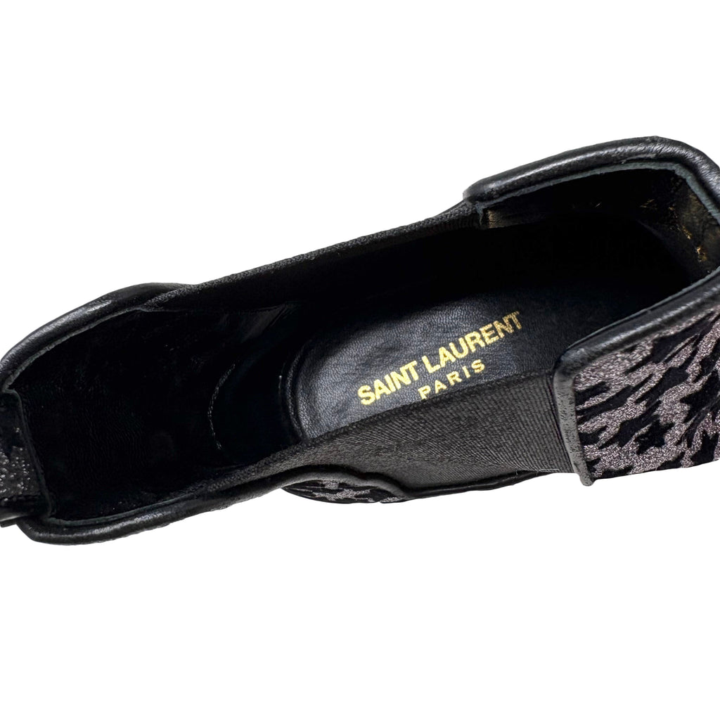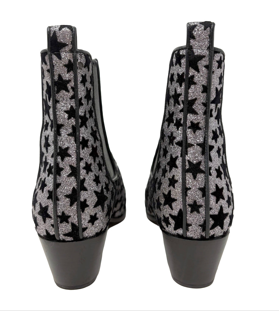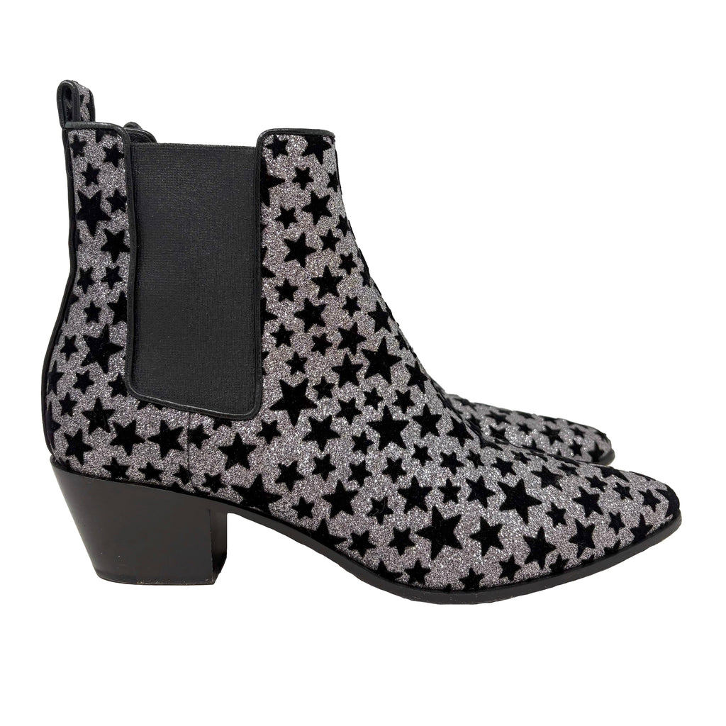 - Saint Laurent silver glitter ankle boots featuring an allover black velvet star motif.